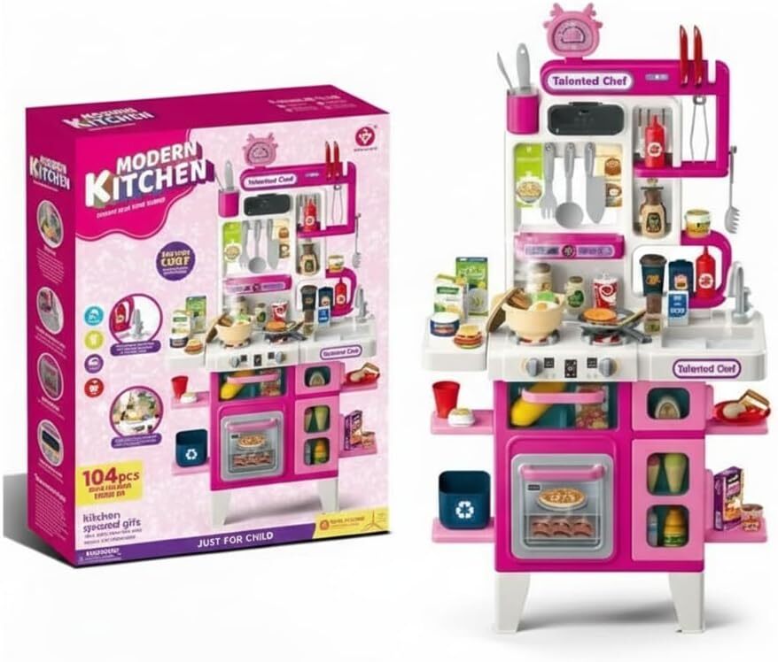 مجموعة مطبخ شاملة: تتضمن مطبخ منزلي محاكاة للأطفال مع موقد طبخ تفاعلي، حوض تنظيف بحنفية مياه، أدوات مائدة متنوعة، وإكسسوارات طعام واقعية لتجربة لعب غامرة