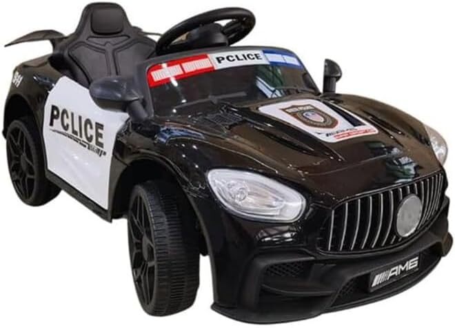 AMG-Style Kids Police Car – Features LED lights and a siren, suitable for children aged 3–8 years. Color: White and Black.